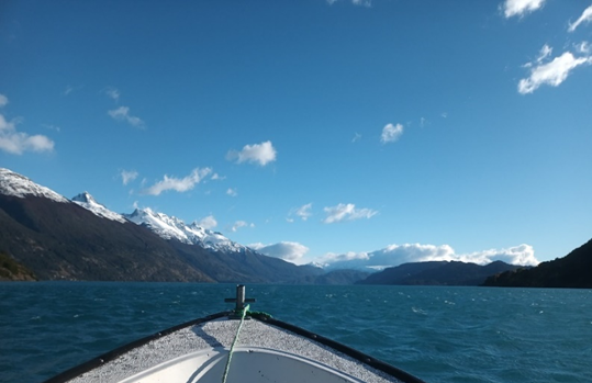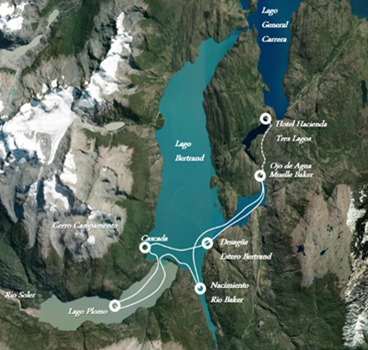 We will depart from the Hacienda Tres Lagos Hotel, to go by van to our dock located on Bertrand Lake, just 5 km away, where we will take one of our boats and navigate the emerald green waters and main tributary of the largest river in Chile, the Baker River (870 m3/s). The navigation lasts 30 minutes through this lake of glacial origin with a basin of 48.1 km2. passing the Bertrand River, we will arrive at Plomo Lake. At the demarcation of these lakes, we will see that the leaden waters from glaciers do not mix, due to the different densities, generating a unique phenomenon.  It is striking that, on the shores of Plomo Lake and its tributary Soler River, as well as on the shores of Bertrand Lake, the descendants of the first settlers who continue to sail to Puerto Bertrand continue to live, to supply themselves every few months.